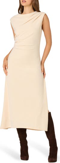 Sharp pleats bring texture and dimension to this sleek figure-skimming midi punctuated with a daring leg-baring slit.