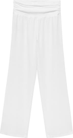 A ruched-and-draped waistline adds ease and comfort to these lightweight linen-blend pants punctuated with flowy wide legs.
