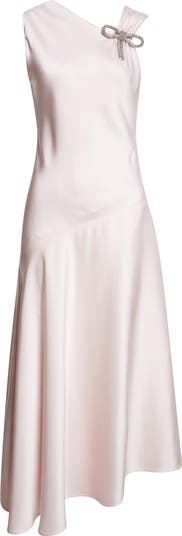 Newly appointed creative director Simone Bellotti transforms Jil Sander's celebrated simplicity into something subtly sparkly and ultraluxe with this glossy crepe-back-satin dress, where a detachable crystal bow glimmers from the gathered shoulder strap.