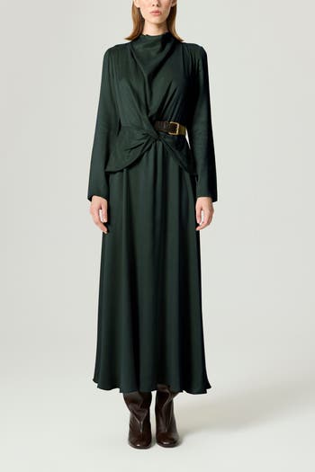A masterclass in effortless elegance, this maxi dress features a high draped neckline and softly gathered side wrap detail that cinches at the waist with a sculptural buckle belt. Crafted in a fluid woven fabric, the A-line skirt flows gracefully to a full-length hem. Long sleeves offer added sophistication, while the concealed back zip ensures a smooth fit. Unlined for lightweight wear, it transitions seamlessly from formal soirées to refined evening plans.