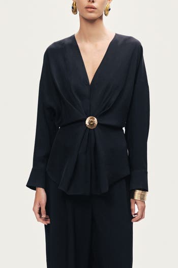 A fluid shirt defined by a deep V neckline and soft draping, finished with a statement buckle that cinches the waist. Designed to create an elegant silhouette with effortless movement.