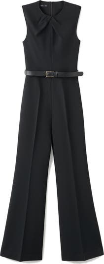 A sleek belt defines the waist of this sleeveless jumpsuit made with vertical creases and wide hems for a leg-elongating effect.