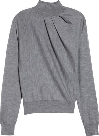A finely knit merino wool blend enables the signature drape at the yoke (inspired by the look of a leather jacket slung from the shoulders) of this mock-neck sweater patterned in perpendicular jaspé striations.