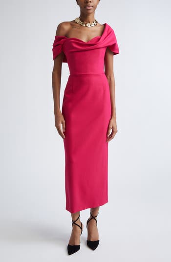 The asymmetric, off-the-shoulder neckline adds elegant drape and dimension to the sleek, figure-skimming silhouette of this column dress tailored from stretch-kissed virgin wool in a statement hue.