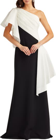 Get every glass raised in a seriously striking gown draped in pleated satin detais and painted in a vibrant hue.