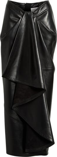 Inspired by the act of draping a leather jacket over a mannequin, panels of ultrasmooth plongé lambskin are artfully arranged in a sculptural cascade of ruffles on this asymmetric column skirt.