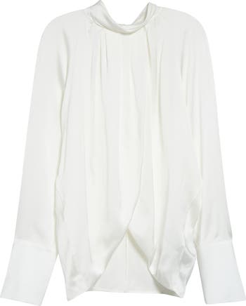 This drapey silk charmeuse top is cut with smooth raglan sleeves and a curved tulip-shaped front, while a high neck and deep split cuffs provide dramatic finishing touches.