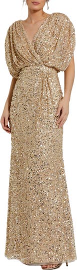 Sequin gown featuring a V-neckline, ruched detailing, and draped short sleeves, offering a chic and elegant look for special occasions.
