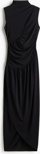 Calf-length, sleeveless dress in stretch jersey. Features a slim fit with a turtle neck, gathers on one shoulder and curved, gathered seams at the front and around the waist creating an asymmetric, draped effect. Wrapover skirt with a tulip hem.