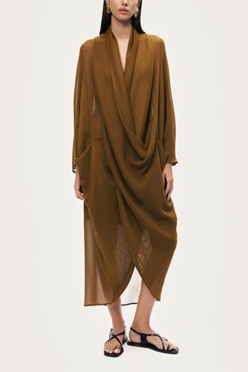 A fluid midi dress defined by a softly draped V-neckline and a relaxed silhouette that offers effortless elegance. Wear with flat sandals for daytime ease or elevate with heels for a refined evening look.
