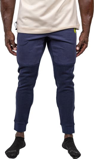 An angular lion logo puts a signature stamp on these slim-fit joggers paneled with a contrasting mix of waffle-knit and smooth fabrics.