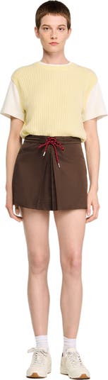Pleated skort with a contrasting trompe l'oeil drawstring waistband and side pockets.