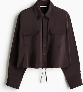Short shirt in woven fabric with a collar and buttons down the front. Flap chest pockets, a yoke at the back and gently dropped shoulders. Long sleeves with wide, buttoned cuffs and a sleeve placket with a link button. Straight-cut hem with a drawstring.