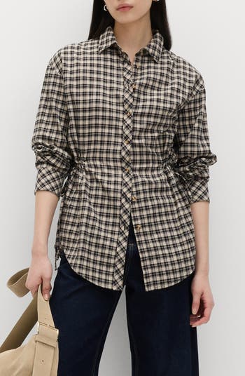 Side ties and gather cinch the waist of this otherwise-roomy cotton shirt patterned in classic plaid and finished with cross-cut patterning at the placket and cuffs.