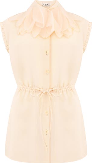 Sleeveless button-up blouse with a drawstring waist and subtle tonal floral appliqu at the neckline for a refined, modern finish.