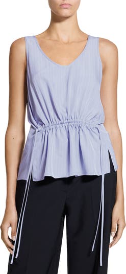 Ticking stripes softly pattern this tank top featuring a cinchable drawstring at the waist.