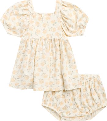 A ditsy floral print and voluminous puff sleeves enhance the whimsical charm of this cotton dress and matching bloomers set made just for blossoming babe.