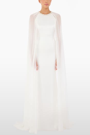 Sculptural simplicity meets dramatic elegance in this refined designer wedding dress. The sleek column silhouette is elevated by a fluid chiffon cape that drapes effortlessly from the shoulders, creating a striking sense of movement. A high neckline adorned with intricate embellishment adds subtle luminosity and balance to the minimalist form. The result is a gown that embodies modern grace and timeless sophistication.