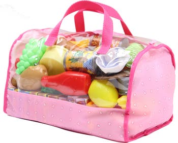 - PLAY FOOD BAG SET - Introduce your kid to the world of culinary creations with this brightly colored 120 plastic play food set. This realistic plastic food toys set includes vegetables, fruits, a variety of grocery options - cereal, tin food, poultry, and delicious desserts all neatly packed in a carry bag