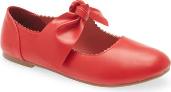A floppy bow graces the strap of a faux-leather Mary Jane boasting a scalloped top line and flexible frame to keep your little dancer light on their toes.
