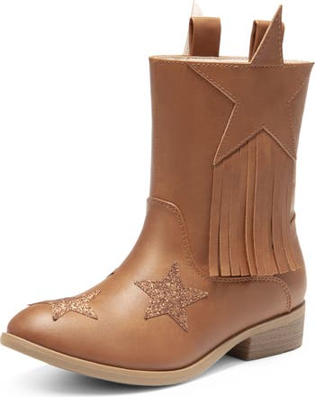 Glitter-encrusted star appliqués and cascading side fringe add whimsical charm to adorable Western boots grounded by a slip-resistant sole for play-ready wear.