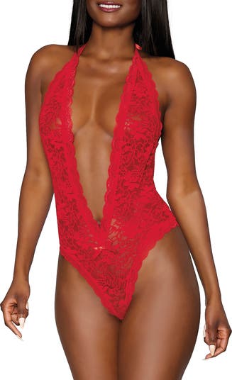 Stunning lace gives shape to a plunging halter-neck teddy for pretty, sensual vibes.