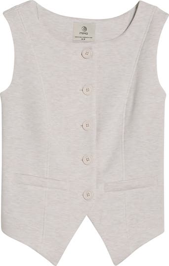 Soft knit construction keeps the feel relaxed, while a streamlined button-front and pointed hem bring just enough structure for a casual-meets-polished look.