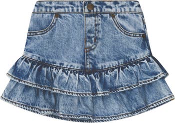 The kind of skirt they'll want to wear again and again. This 90s style mini is made from deliciously dreamy denim in in quintessential blue. It features a stretchy waistband, side and back pockets and a pretty frill tiered hem.