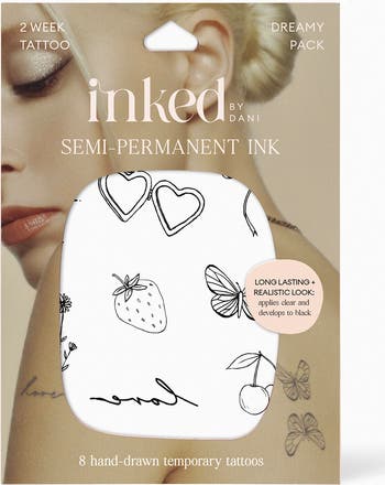 What it does: The pack features eight hand-drawn designs that are realistic looking, apply clear and develop to black. The semi-permanent tattoos are designed to last on skin for two to four weeks and feature a more realistic look than INKED by Dani's original temporary tattoos.