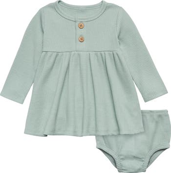 Keep your little girl cozy and stylish with our charming dress set, designed for cooler weather adventures! Made from premium mini waffle knit fabric, this ensemble features long sleeves to keep her warm and happy. Stylish ruffles on the skirt add a playful touch to her look, while the rounded neckline ensures all day comfort. The accompanying diaper cover has comfort-stretch ribbing on the waistband and leg holes for a secure fit, allowing her to move freely and comfortably. Complete with faux wood buttons on the dress, this set combines quality, comfort, and adorable style for your little one. Our essentials have been independently certified with STANDARD 100 by OEKO-TEX® so that you don’t have to worry about harmful substances in your little one’s wardrobe. Pack includes one dress with matching diaper cover.