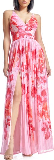 Dreamy blooms bring romantic color to an utterly delightful gown designed with a side slit to showcase your dance moves.