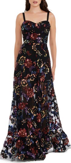Sparkling sequin blooms illuminate this glamorous gown designed with a sweetheart neck and a perfectly draped skirt over a mini lining to reveal some leg.