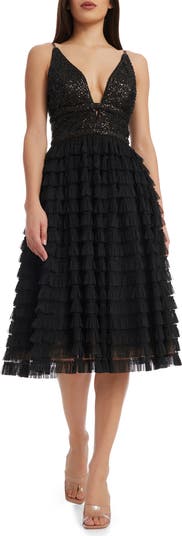 Dazzle and a deeply dipped neckline start the style story for this party-ready dress finished with a full and frothy tulle skirt.