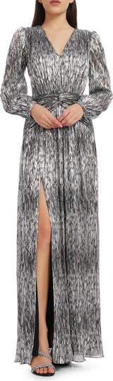 A twist at the waistline lends gorgeous dimension to this striking metallic gown that shimmers with each and every step.