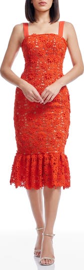 Every single curve is called out with the flurry of flowers sweetening a sultry cocktail dress cut to a beloved midi length.