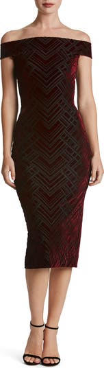 Geometric-burnout patterning adds Art Deco artistry to a figure-hugging, velvet sheath with glamorous, off-the-shoulder styling.