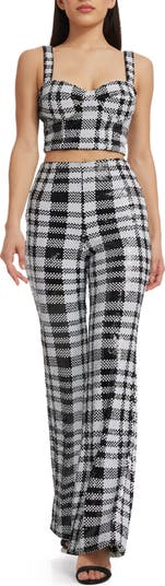 Add sass to your black-and-white collection with this two-piece look that features a sultry bustier top and wide-leg pants.