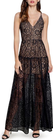 Charm endlessly in this romantic lace gown cut in a sleeveless silhouette with a flowing semi-sheer skirt.