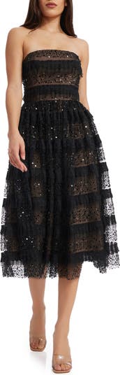 Let your elegance shine in this strapless fit-and-flare cocktail dress covered with gorgeously arranged sequins, beading and frothy lace ruffles.