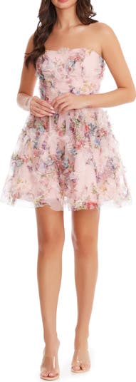 Fluttery ruffles and a blooming flower print bring dreamy allure to this gala-ready minidress that shows off your shoulders.