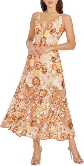Allover sequined flowers in earthen hues make this midi-length cocktail dress with a plunging neckline stun with every step.
