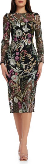Colorful sequin flowers stand out against a dark background on this elegant sheath dress designed with a sheer yoke and long sleeves.