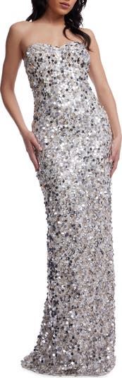 Catch the light from every angle in this stunning satin-lined gown covered in dazzling paillettes. A high back slit and a hint of stretch ease your every move in this figure-hugging design.