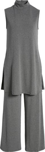 Go with the flow in this relaxed two-piece outfit featuring a longline sleeveless top and matching wide-leg pants.