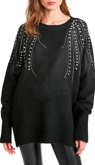Sparkling rhinestones drip down from the shoulders of this oversized sweater, putting a polished finish on this cozy style.