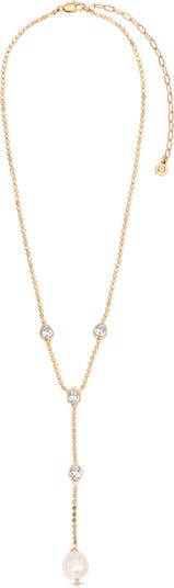 Teardrop cubic zirconias, polished beads and a central freshwater pearl give fluid glow to this 18-karat gold-plated necklace.
