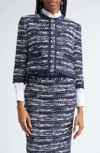 Thom’s reimagining of classic American codes for the modern wardrobe goes for statement-making texture in this lookbook-featured crop jacket made from mélange tulle tweed featuring eight different yarns.