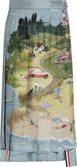 The label's signature pleated skirt inspired by prep-school uniforms gets updated for the pre-fall '26 season in this lookbook-featured silk version in a print inspired by painter Grandma Moses. One of her folksy Nantucket scenes captures her childlike, naive aesthetic and brings quintessential American beauty to the split, dropped-hem silhouette, which allows peeks of the tricolor grosgrain trim.
