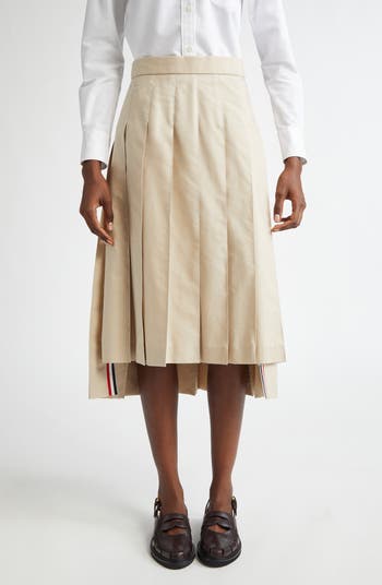 Signature tricolor stripes mark this schoolgirl-inspired skirt featuring a split, dropped hem and pronounced pleats.