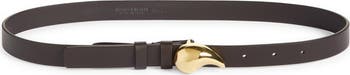 A golden droplet anchors the buckle of an elegantly sparse belt fashioned in Italy from fondant-colored calfskin.